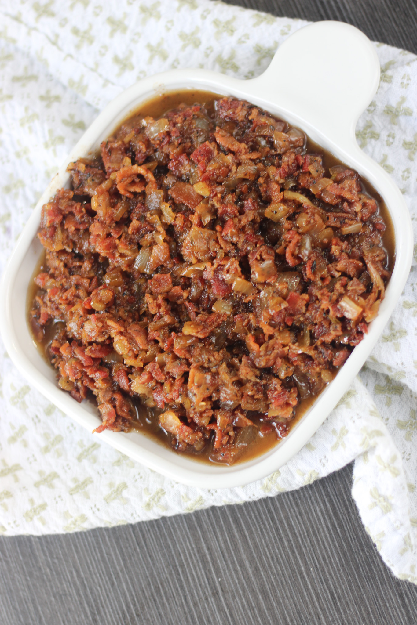 Now, mix together your seasonings and spices, your chopped bacon, and your cooked onions into the pan and let it cook down until everything is browned.