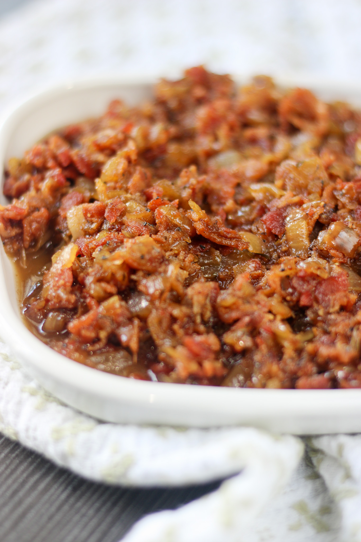 This bacon jam goes great on crackers, over sausages hot dogs and more.
