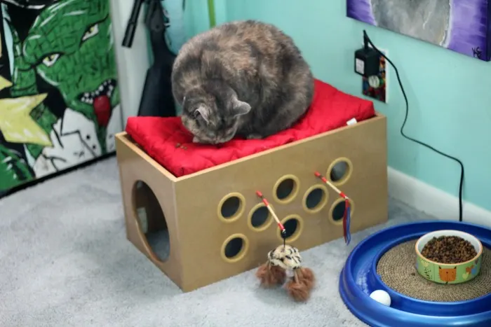 Now that we have finished putting everything together, it looks great. Mittens loves her space, and she spends a lot of her time in there just hanging out in her special space. Yes, this cat is super spoiled. In fact, we even make her a cat birthday cake every single year.