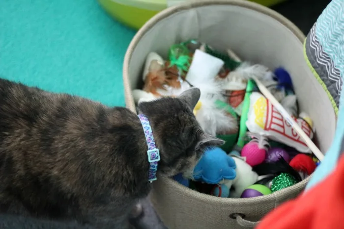 Mittens has her own toy bin. We found a really cute one at Michael's that was on sale, but I also found these on Amazon that look the same, just a different saying on the front.