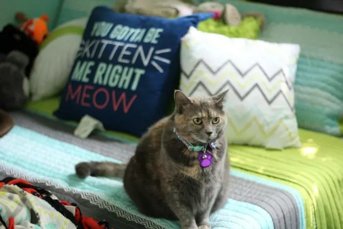 Every cat loves a good nestling spot — and Mittens is right at the top of Kayla's bed. She decorated with fun cat pillows we found at Kohl's and Amazon.