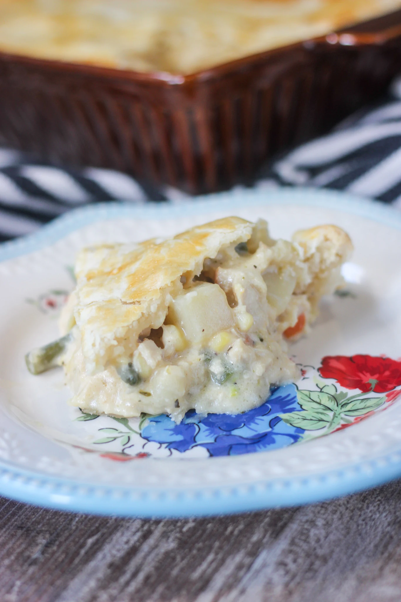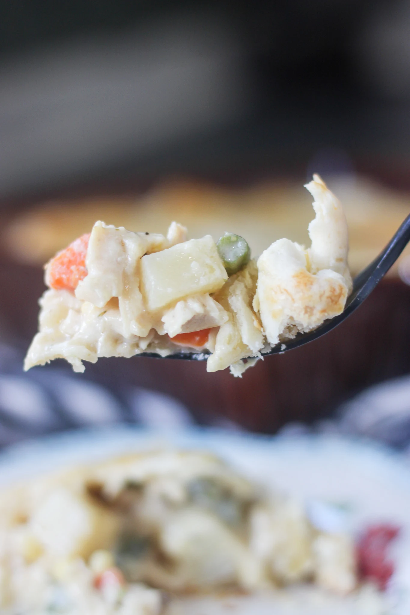 Line a 9-inch deep dish pie dish with one of the crusts, pressing it gently into the bottom and sides. Pour the creamy chicken filling into the crust and spread evenly. If you have some of the filling left over, freeze it for a later date to make another pie.