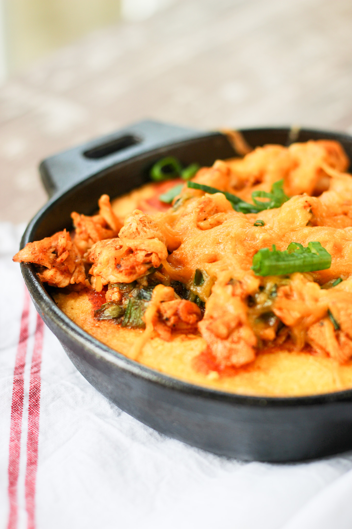 Take this chicken mixture, put it on top of the cornbread, and then top that with shredded cheese. I like to use straight cheddar because it has that tangy bite that adds extra flavor to the dish.