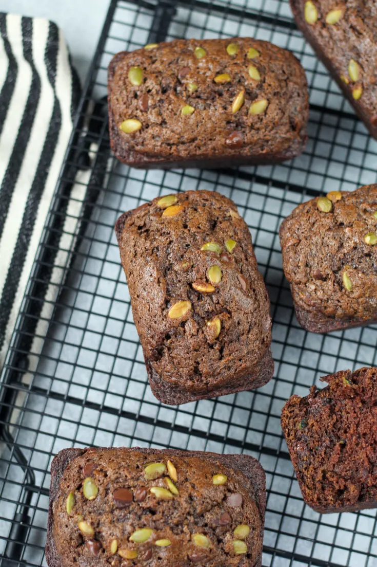 These chocolate zucchini bread mini loaves are so full of flavor and simply delicious. Topped with salty pepita seeds and chock full of grated zucchini for a moist and fudgy bread.