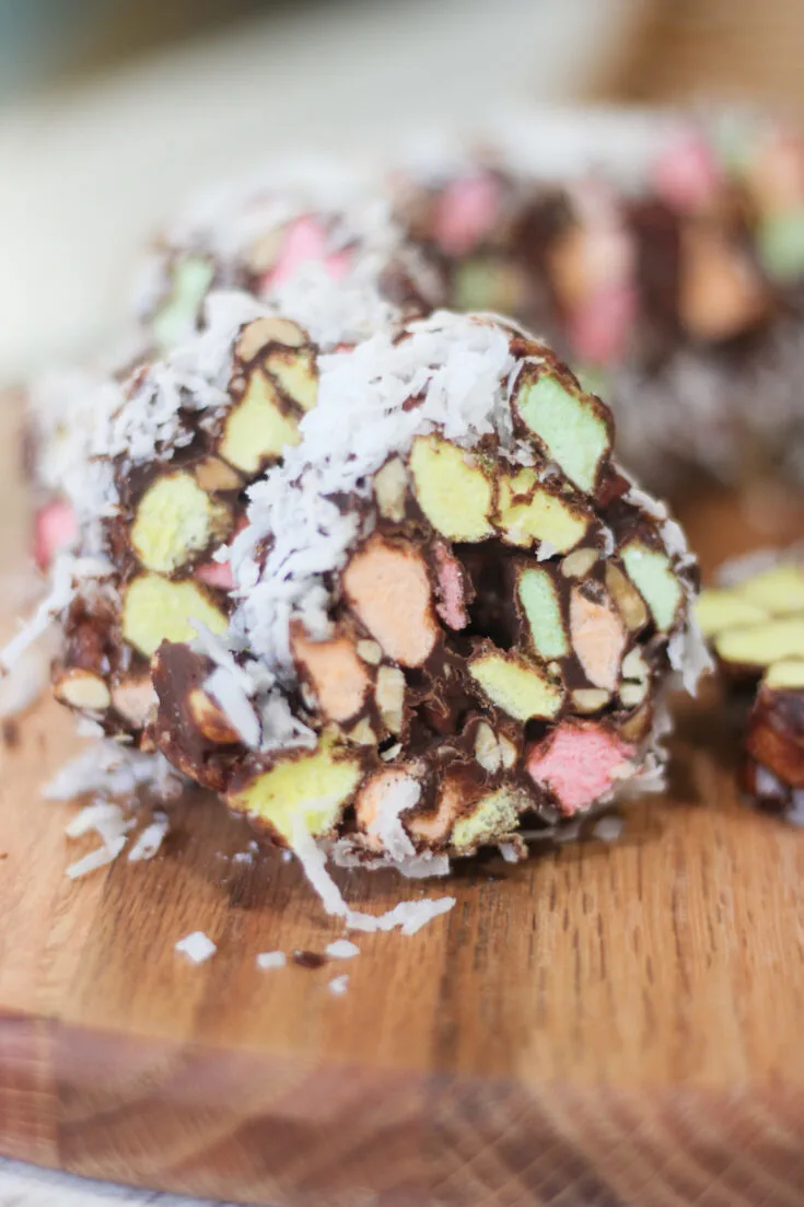 1. Melt chocolate and butter In a medium saucepan over low heat, melt the chocolate chips and butter, stirring constantly until smooth. Remove from heat and allow to cool 8–10 minutes, until warm but not hot. 2. Add marshmallows and nuts Stir in the vanilla, then gently fold in the colored mini marshmallows and optional nuts until everything is evenly coated in chocolate. 3. Prepare the coconut roll Lay out a large sheet of wax or parchment paper. Sprinkle a thick, even layer of shredded coconut over the paper — this will coat the outside of your cookie log. 4. Form the log Spoon half of the chocolate-marshmallow mixture onto the coconut and shape it into a log. Roll the log tightly in the coconut, pressing gently to help it stick. Twist the ends of the paper to secure. Repeat with the remaining mixture and more coconut. 5. Chill completely Refrigerate for 2–3 hours or until firm all the way through. 6. Slice and serve Remove the chilled logs from the paper. Slice into ½-inch thick rounds to reveal the colorful “windows.” Enjoy immediately or store for later!