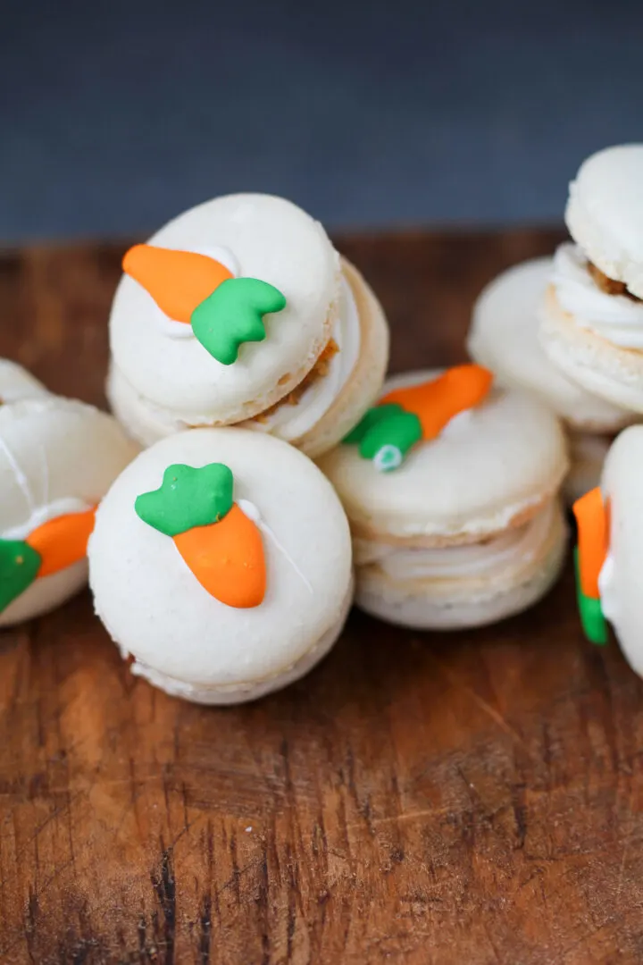 - Carrot Cake Macarons: Delicious carrot cake flavored macarons with a cake center and then topped with a royal icing carrot.