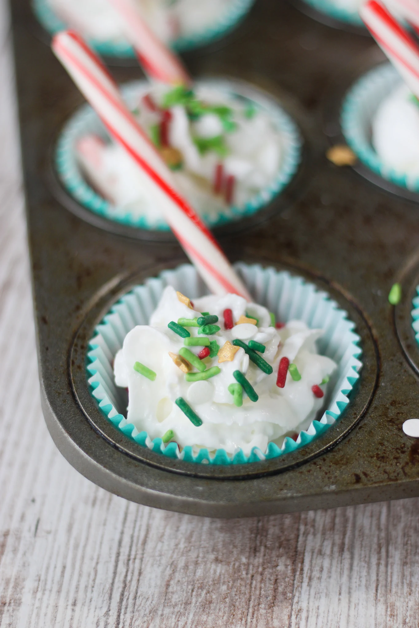 Frozen hot cocoa toppers made with whipped topping and peppermint sticks melt perfectly into hot chocolate for a fun, festive treat.