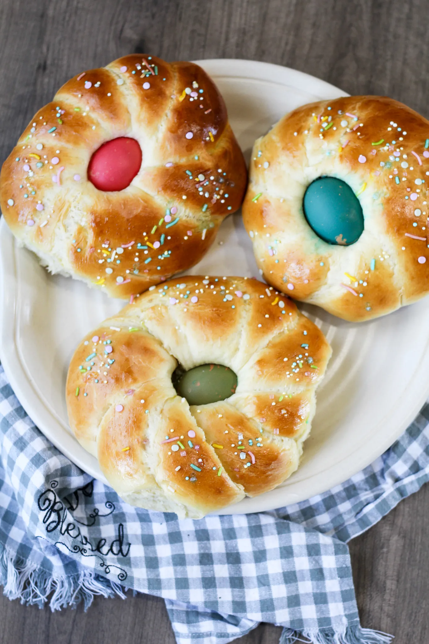 Sweet Italian Easter Bread is a tender bread with a hint of sweetness. Baked in the center is a beautifully colored egg. Top the bread with powdered sugar, sprinkles, or even a drizzle of my brown sugar syrup.
