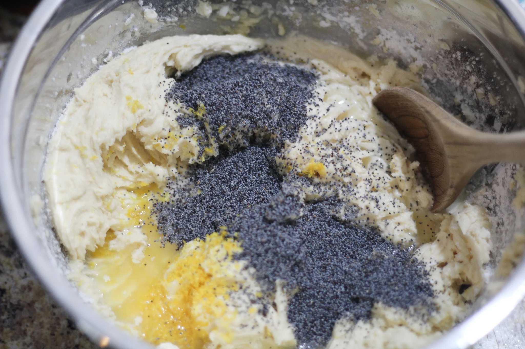 - Add the lemon zest and poppy seeds and gently stir to combine.