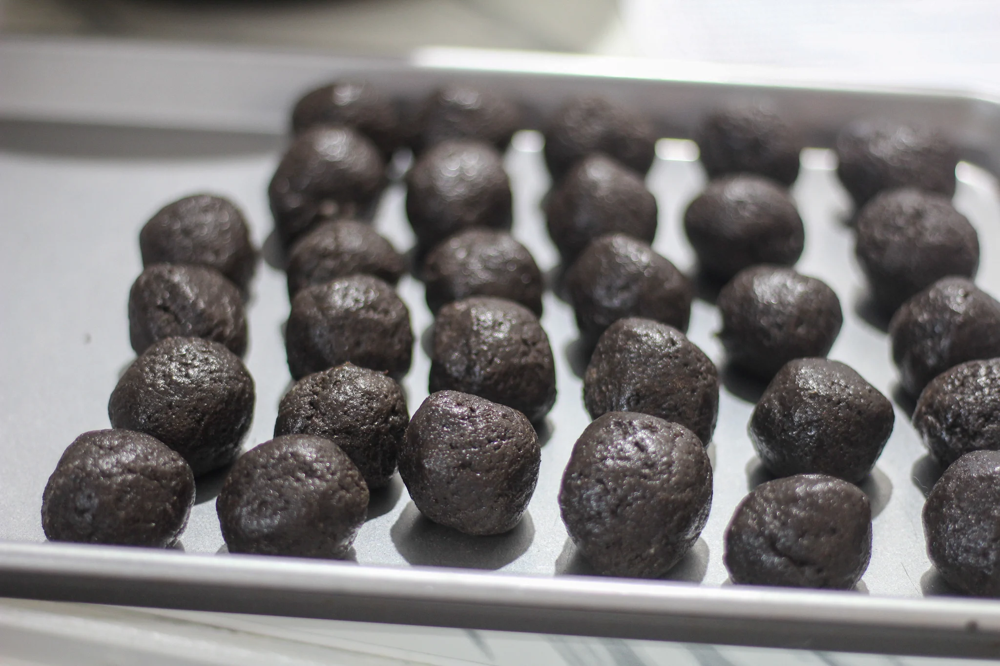 - Using your cookie scoop, scoop out the dough and roll it into your palms until you create a smooth round ball of dough.