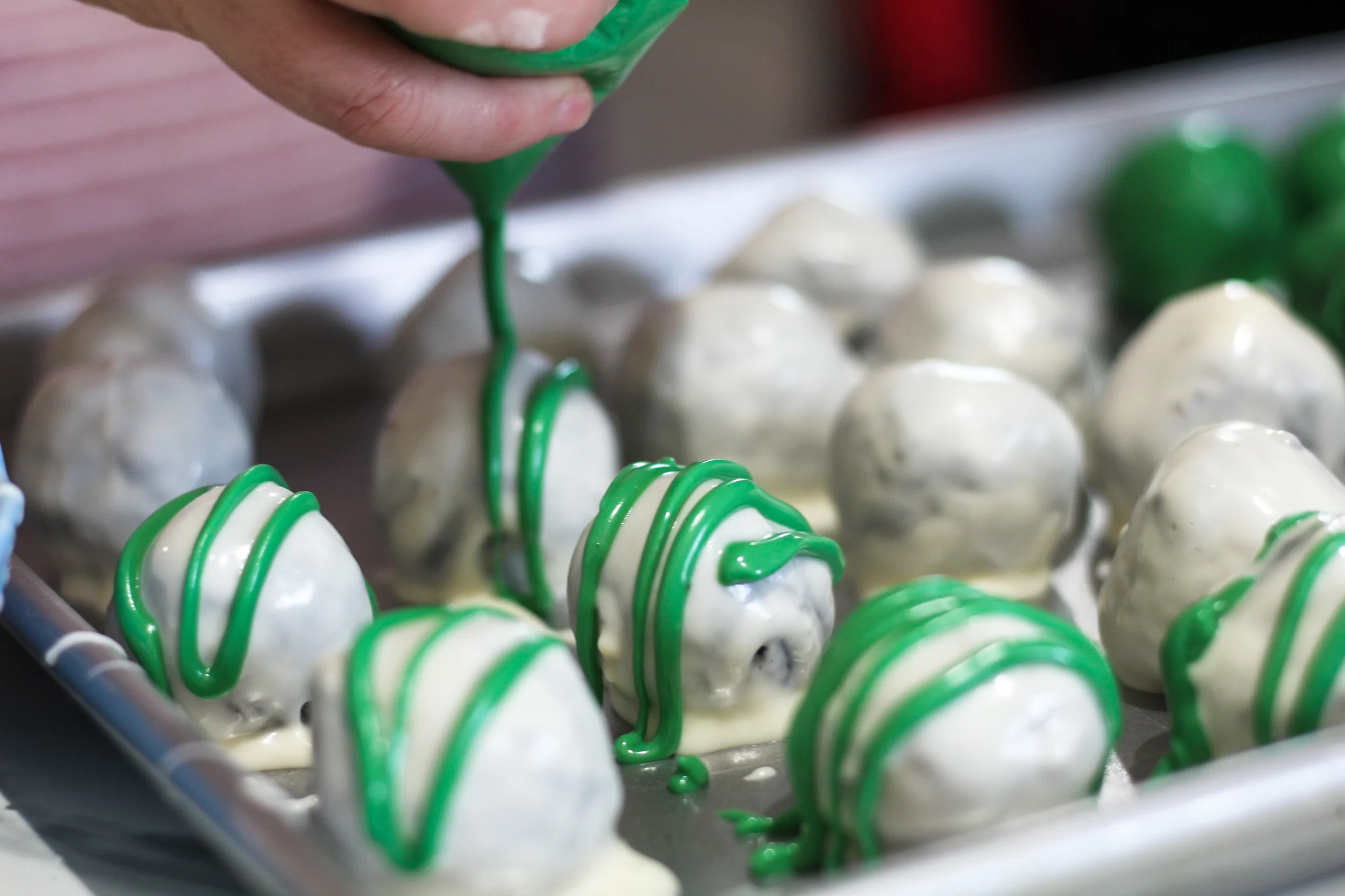 - Take the remaining chocolate after all the balls are coated and place each color in a ziplock bag. Snip the end and then drizzle across the balls.