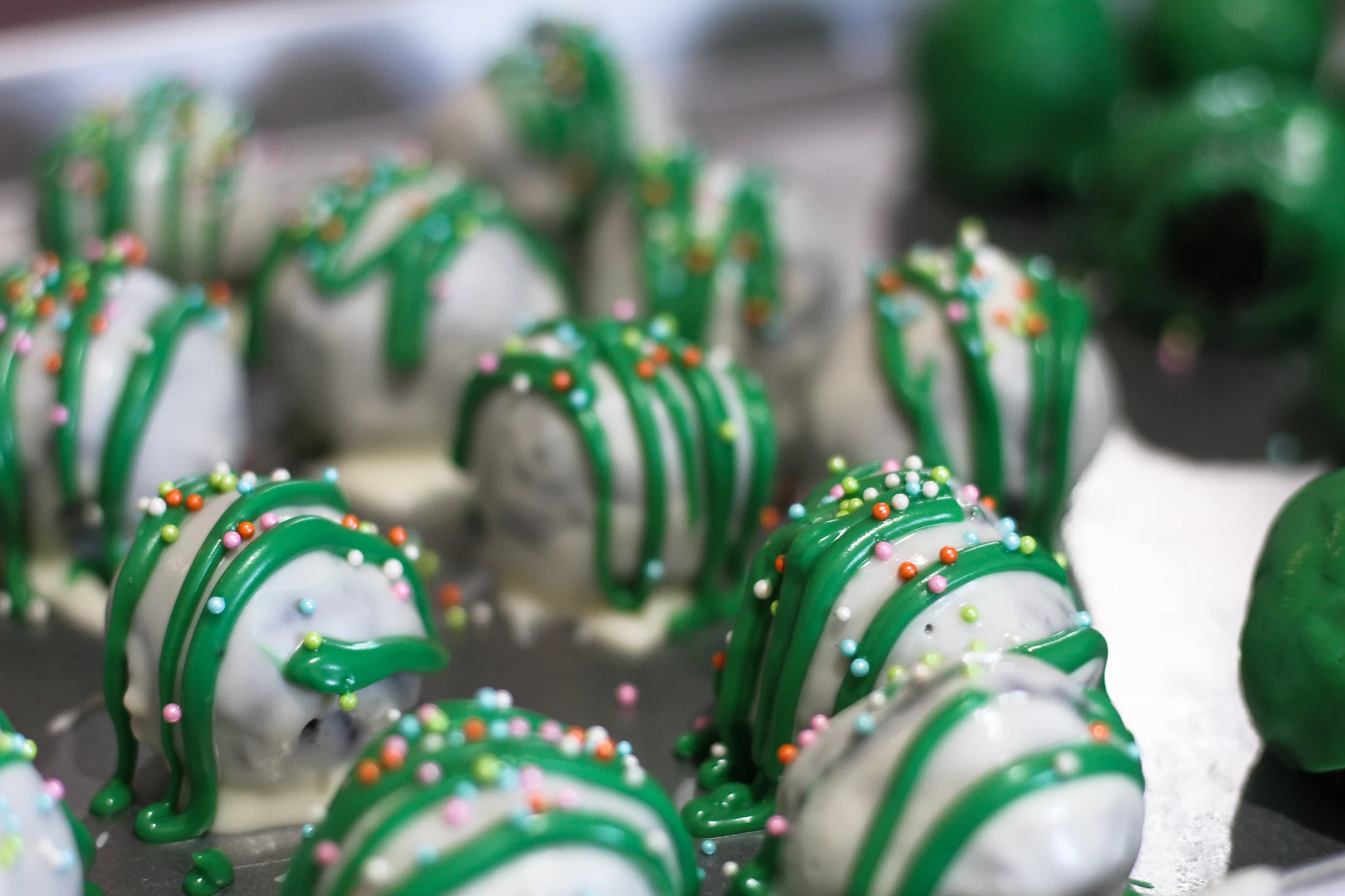 - Roll each ball in the melted chocolate until coated perfectly. Set aside on the parchment-lined baking sheet. Do this with alternating colors.