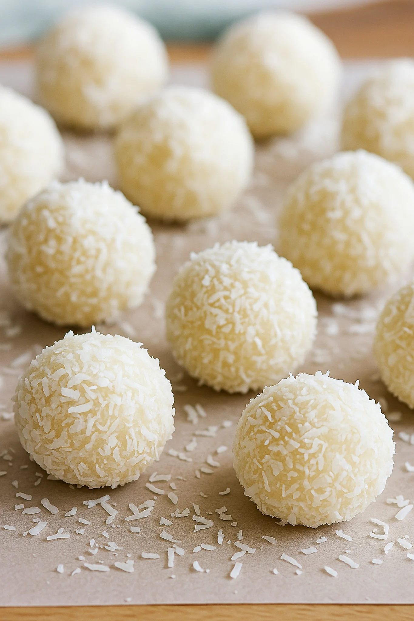 Step 1: Mix the Filling In a large bowl, combine the shredded coconut and powdered sugar. Stir in the melted butter, sweetened condensed milk, and vanilla extract. Mix until the texture becomes thick and sticky — it should hold together when pressed. Step 2: Chill the Mixture Cover the bowl and place it in the refrigerator for 20–30 minutes, which makes rolling much easier. Step 3: Roll Into Balls Scoop out portions of the chilled coconut mixture using a small cookie scoop or tablespoon. Roll each portion between your palms to form smooth, bite-sized balls. Step 4: Coat or Dip (Optional but Delicious!) Roll each coconut ball in extra shredded coconut for the classic “snowball” look. For a richer candy, dip them halfway — or fully — in melted chocolate and place on parchment paper to set. Step 5: Let Them Set Chill the finished coconut balls for at least 15 minutes to firm up before serving.