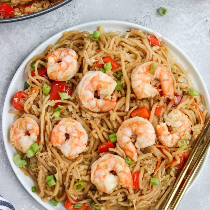 This Whole30 Shrimp Lo Mein is a delicious low-carb and Whole30 version of the classic Chinese food dish. It uses hearts of palm noodles (or any veggie noodle) instead of regular noodles. Gluten-free, paleo, and dairy free!
