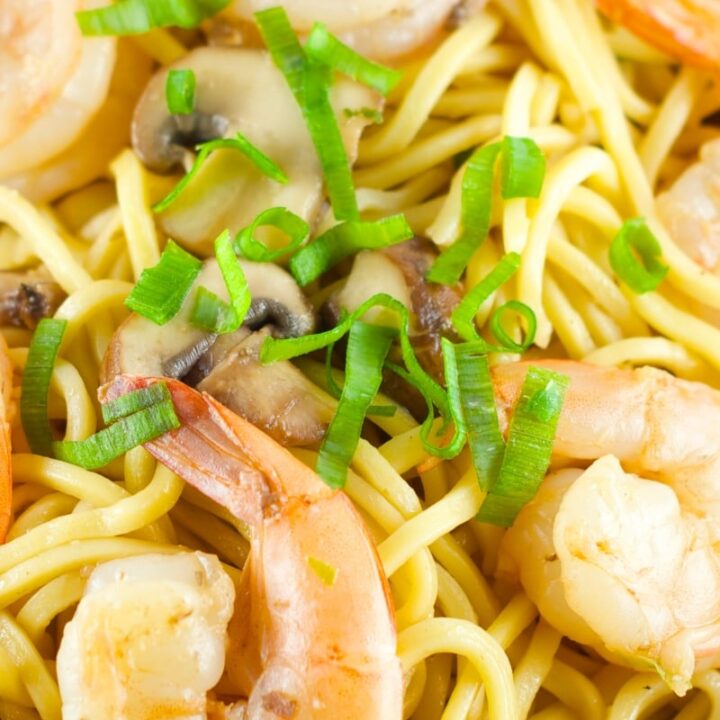 This tasty 15 Minute Shrimp Lo Mein recipe is super easy to make and requires few ingredients. The perfect quick weeknight dinner with an Asian twist that pairs well with P.F. Chang’s Home Menu Signature Chicken Dumplings.