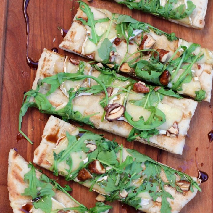 Grilled Flatbread with Brie, Arugula, Candied Nuts, and Balsamic-Honey Drizzle · Erica's Recipes