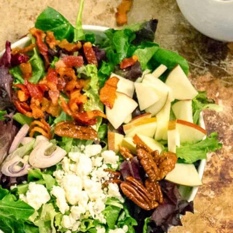 One of the things I love about this Crunchy Apple and Bacon Salad with Candied Pecans is that it can be made year round. Don’t get me wrong, I absolutely love finding my dinner inspiration from a trip to the farmer’s market. But what do you do in the dead of winter when you are craving a huge bowl of something fresh and just bursting with flavor?
