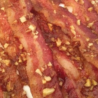 This recipe is praline bacon with chili powder and brown sugar. Topped with chopped pecans – your taste buds will dance.