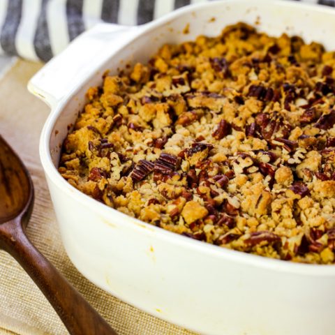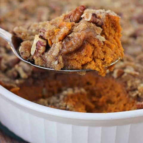 This sweet potato casserole with a praline topping is delicious during the fall season and for holidays. The nuts are a great crunchy bite and using pralines makes for a lighter recipe than those that call for marshmallow toppings!
