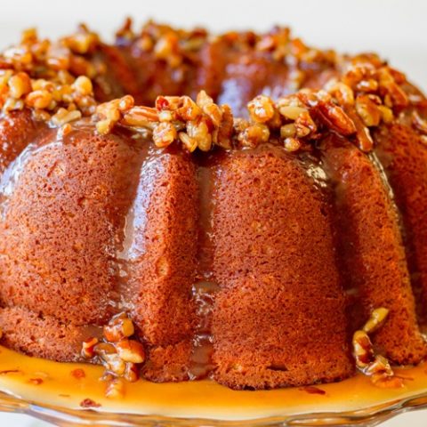 Sweet potato sour cream pound cake is as decadent as it sounds. Flecks of sweet potato throughout topped with a luscious maple pecan praline sauce.