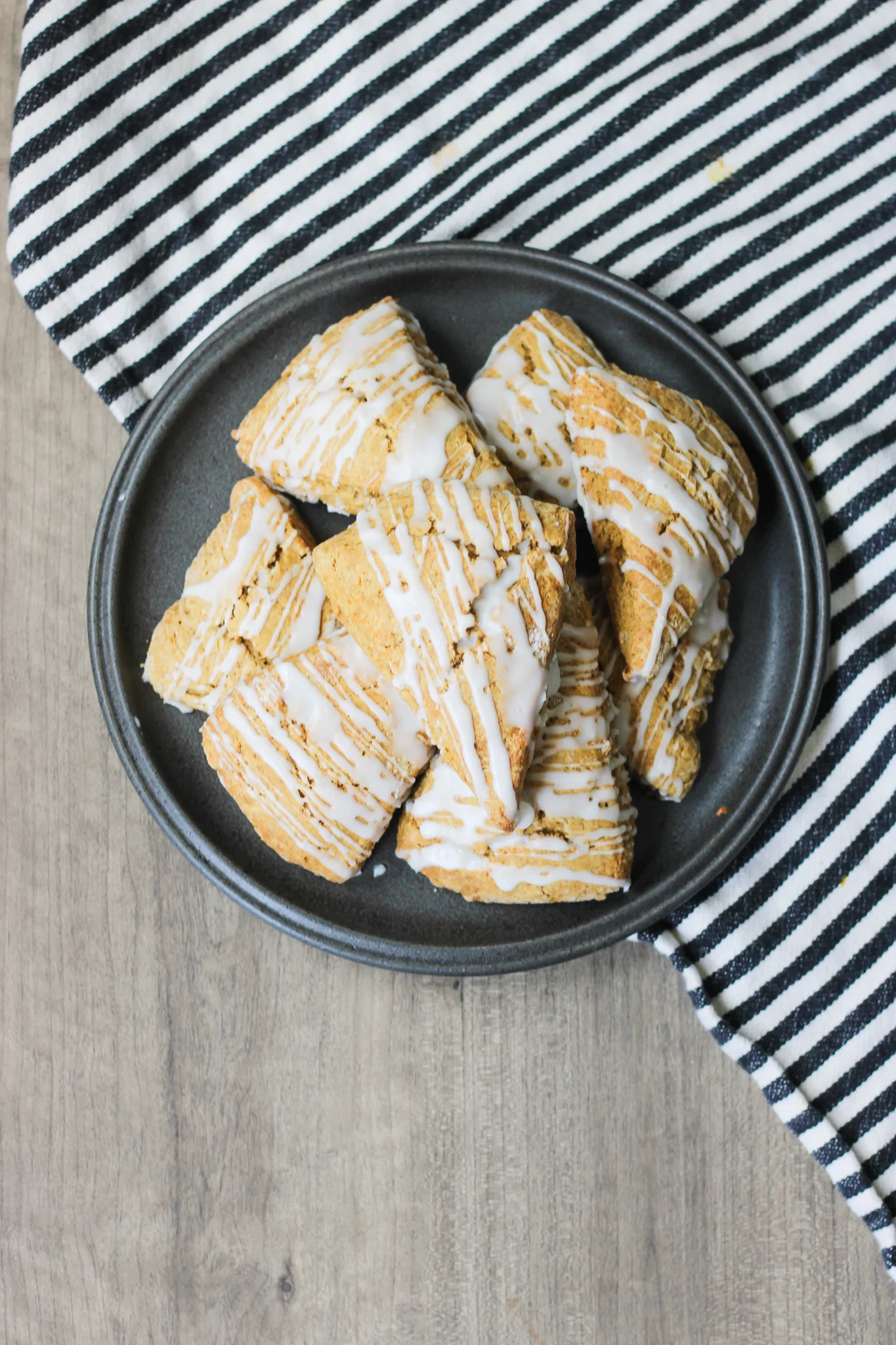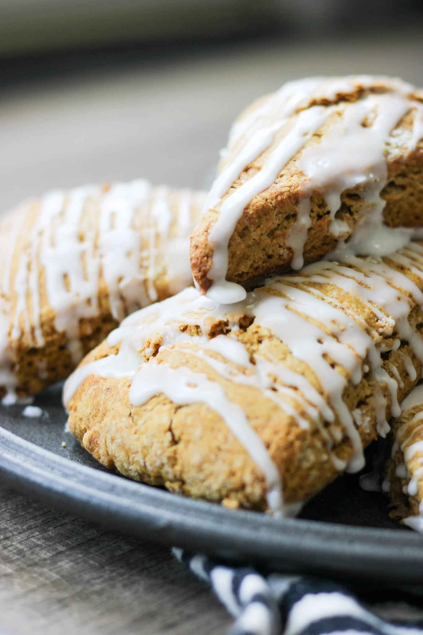 Once the scones have cooled slightly, whisk together the glaze ingredients until smooth. Drizzle over the top of each scone. For extra fall flair, sprinkle with cinnamon or even a pinch of pumpkin pie spice.