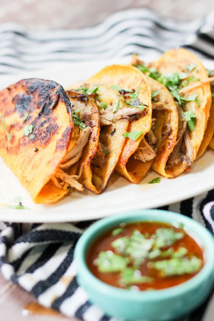 Heat a cast-iron skillet over medium-high heat. Take corn tortillas and dip them in the sauce in the slow cooker, and place them in the screaming hot pan. Top each tortilla with some of the meat and fold the tortilla over the meat, creating a taco.