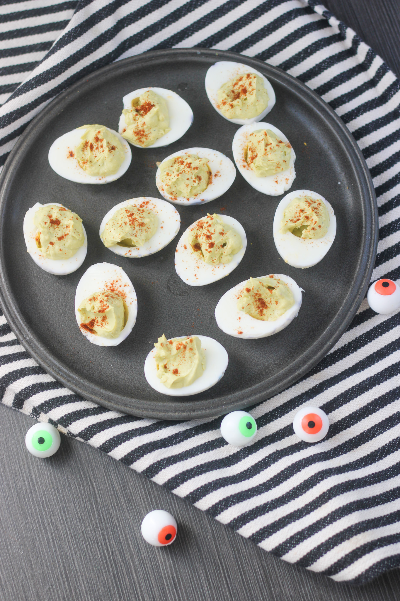 - To make the yolk filling more festive, add a drop of red or orange food coloring for a pop of Halloween color. Or you can do like me and use an avocado to give it a green color.
