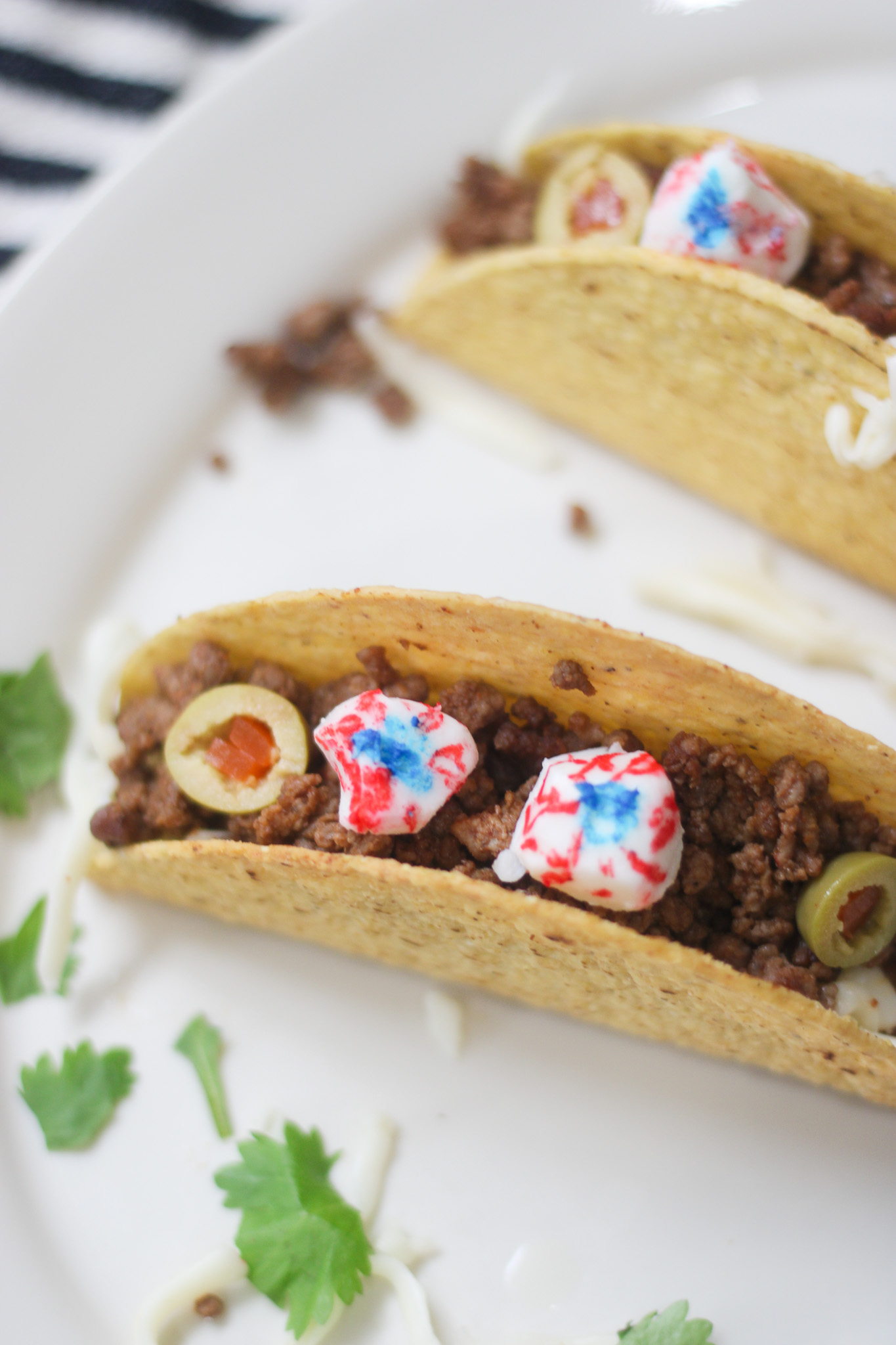 The star of these tacos is the “eyeballs” — made from mozzarella pearls decorated with food-safe markers. A few red veins drawn on each cheese pearl instantly transform them into eerie little eyes that sit right on top of your tacos. Not only are they fun to make, but they also add a creamy bite that pairs perfectly with the taco fillings.