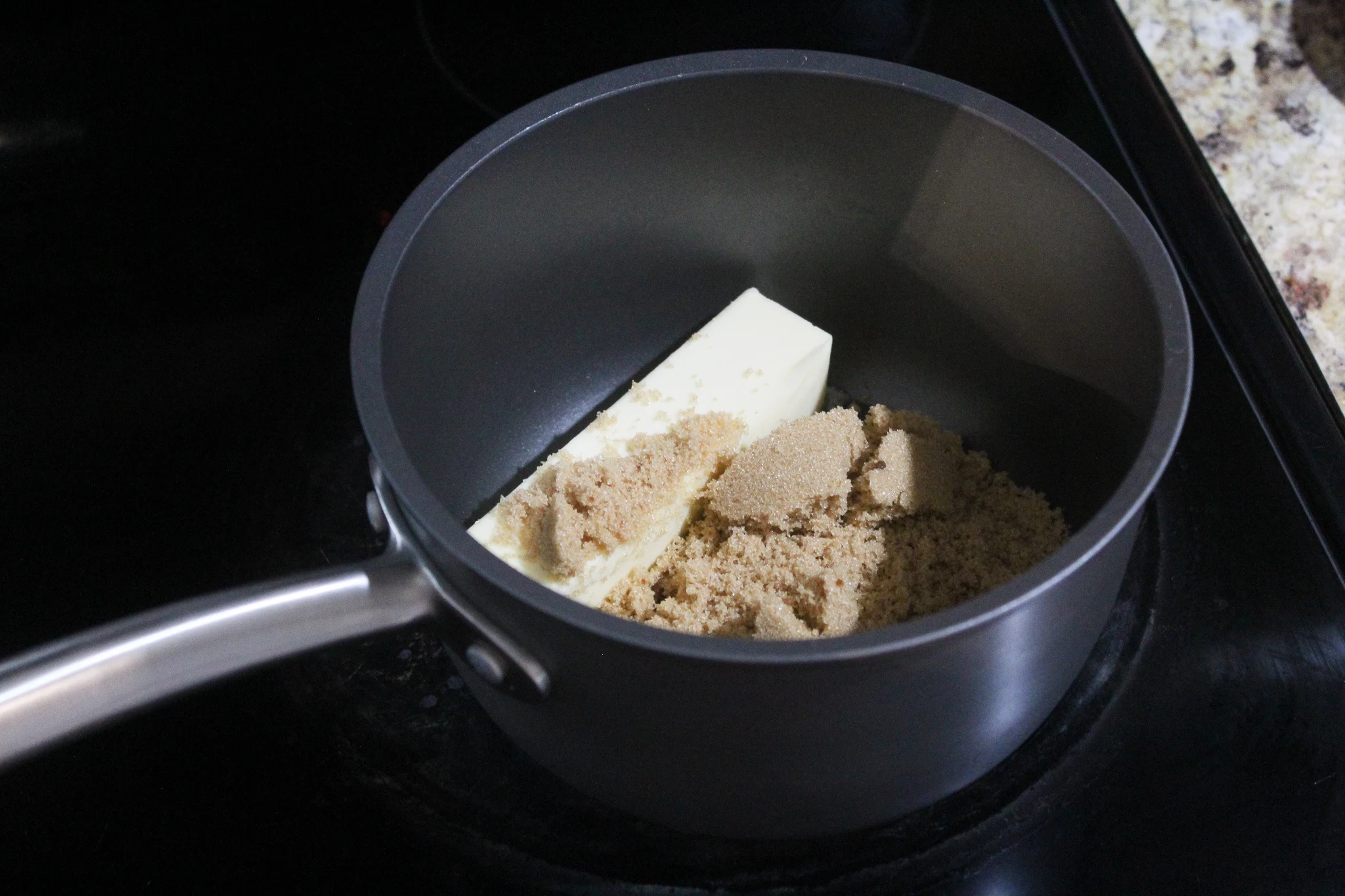 - Place the brown sugar, butter, and salt in a medium-sized saucepan. Cook on medium heat, stirring frequently, until the butter melts. Continue to cook, stirring occasionally, for another 3 to 5 minutes, just until the mixture comes to a boil and starts to darken.