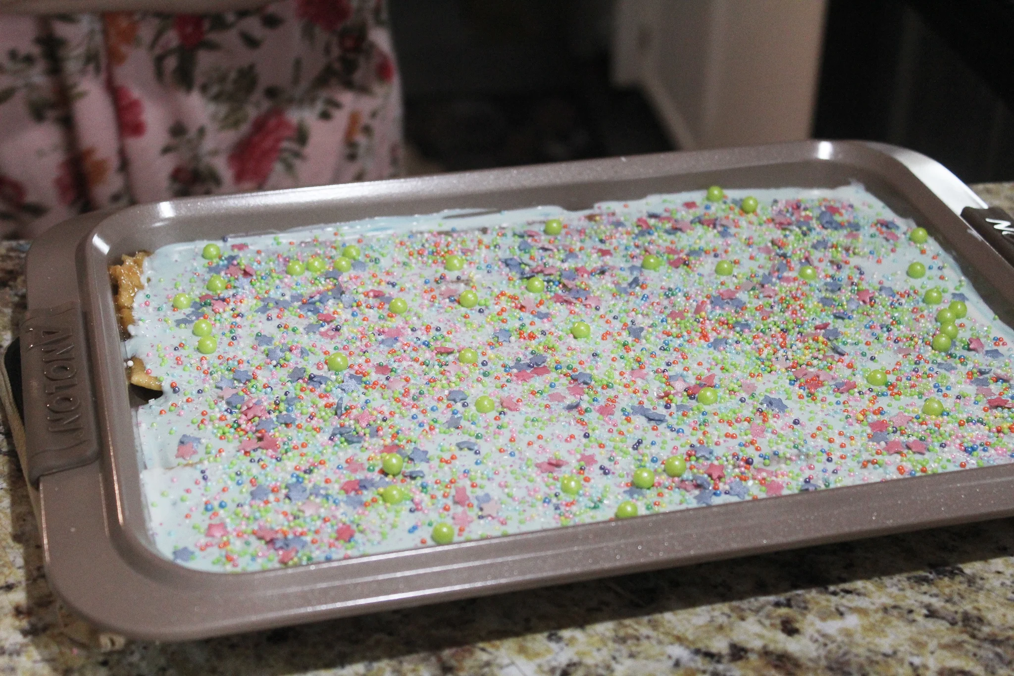 - Top with spring colored sprinkles and then place in the refrigerator to set.