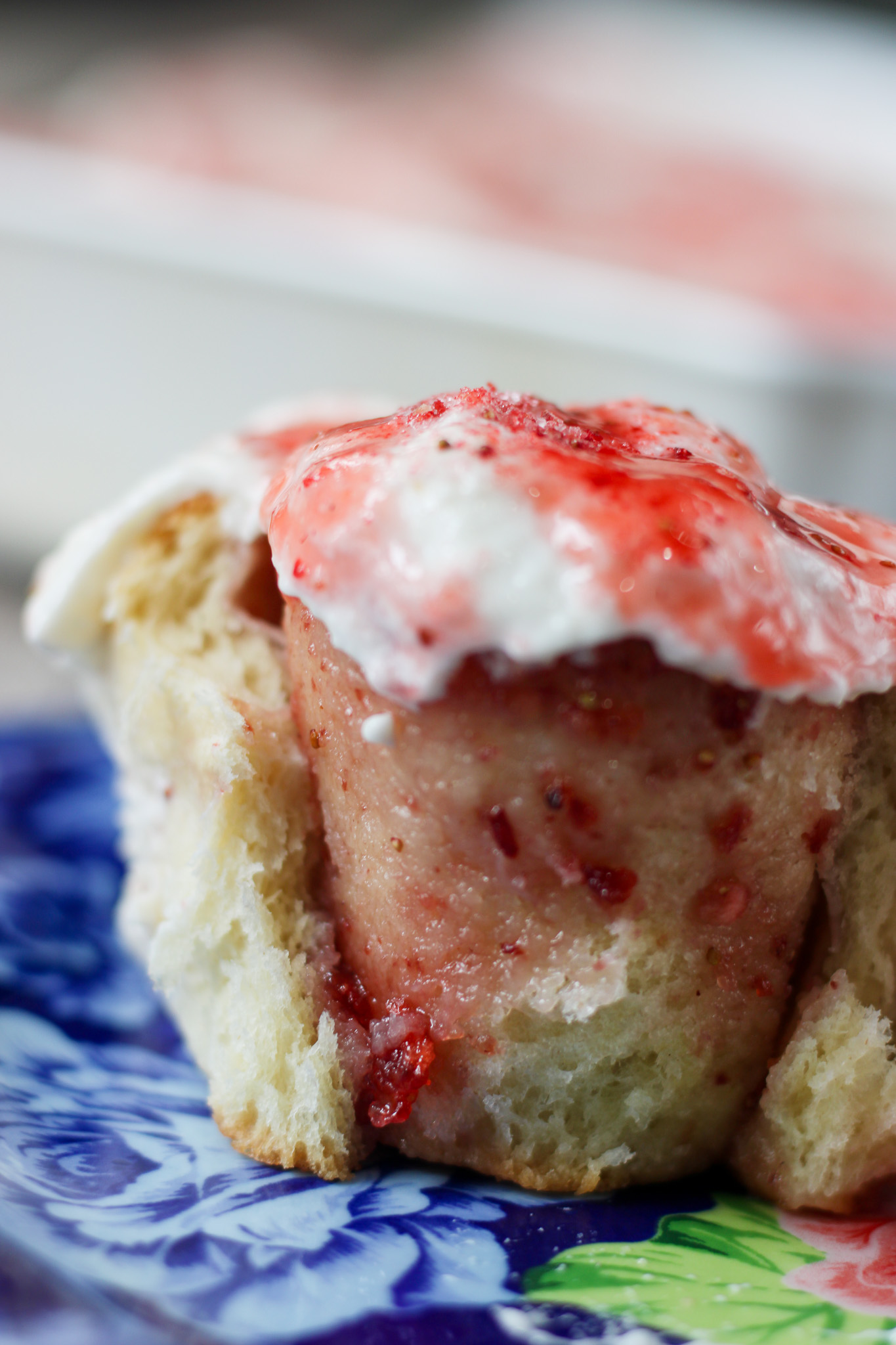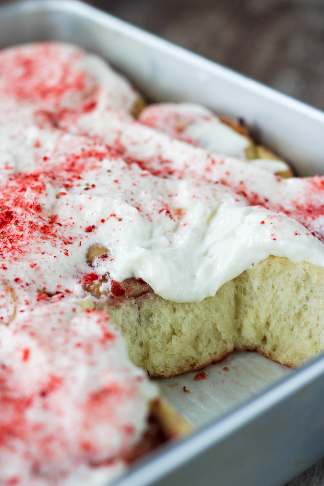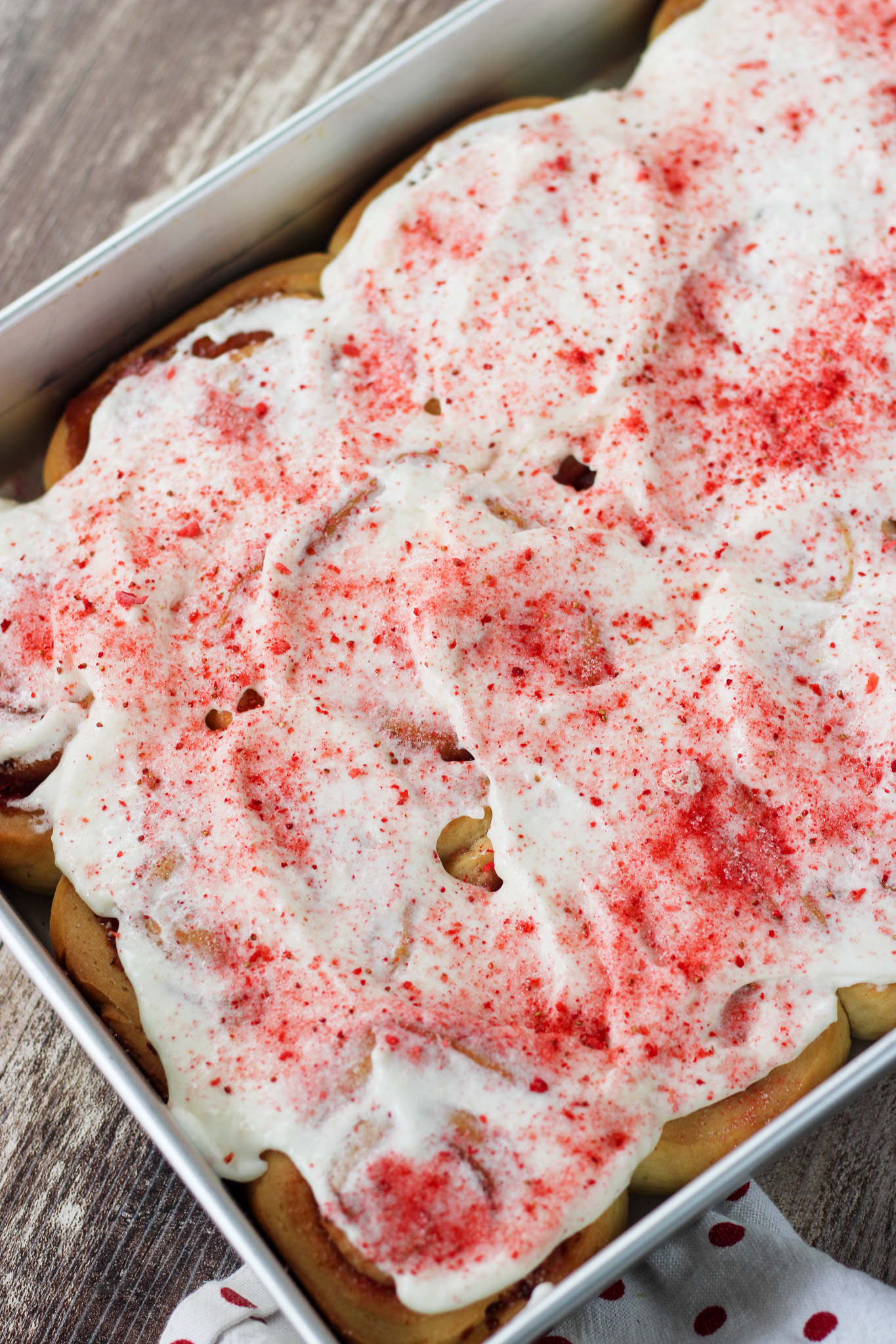 - Beat frosting ingredients until smooth. Spread over warm rolls. Garnish with crushed freeze-dried strawberries.