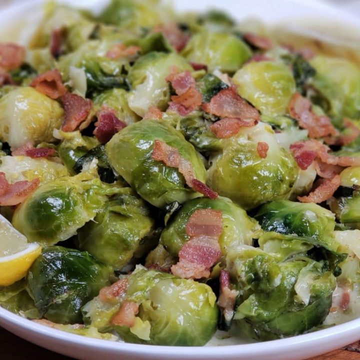 Low Carb Brussels Sprouts Alfredo is a creamy and cheesy side dish loaded with bacon which quickly cooks in the Instant Pot pressure cooker.
