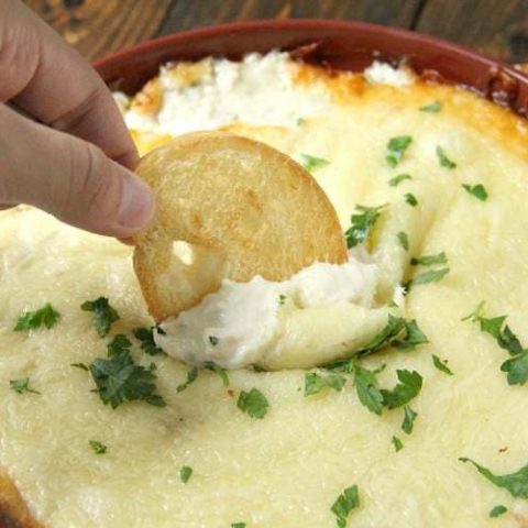 Chicken Alfredo Dip, a fun appetizer with lots of chicken, cheese, and Alfredo sauce. This simple hot baked dip is the best for parties and events and served with veggies, crackers, or crostini.