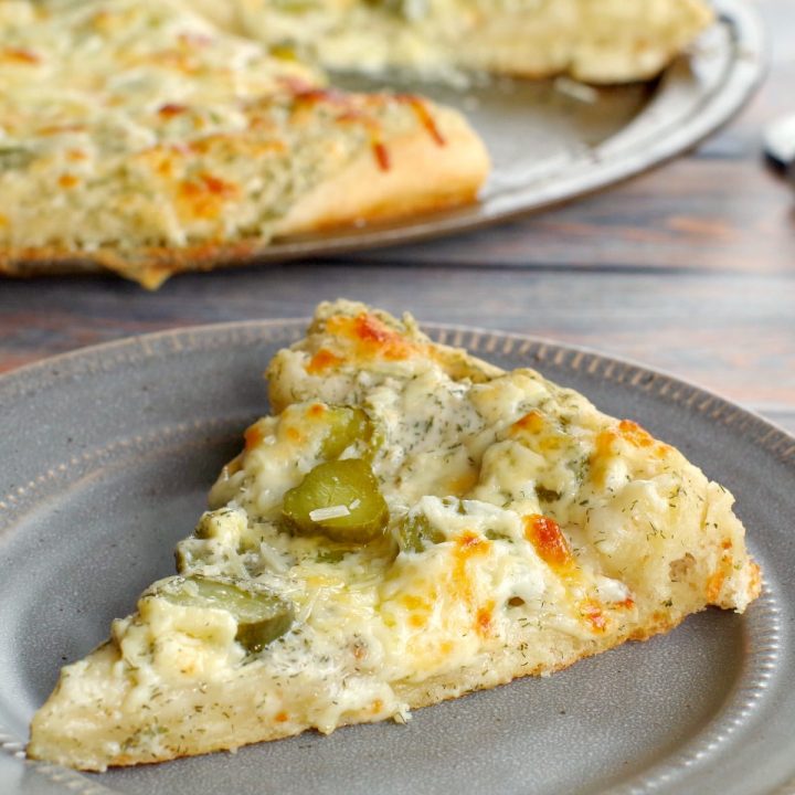 This Dill Pickle Pizza is made with Alfredo sauce, dill weed, and garlic for a rich and creamy pizza sauce that pairs perfectly with pickles! It's carnival food at its finest and tastes just like the Pickle Pizza at the Calgary Stampede.