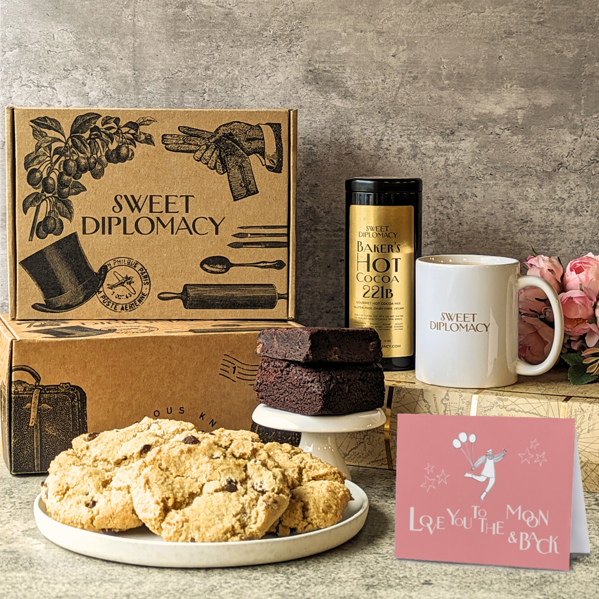 Sweet Diplomacy, a gluten-free bakery with dairy-free and vegan options, has a curated selection of baked goods, hot cocoa mixes, and other love-themed gift choices available to choose from this year. Offering nationwide shipping, Sweet Diplomacy’s Love selections include their Love You Gift Box (featuring brownies, chocolate chip cookies, and an adorable gift card), three different gluten-free, dairy-free, and vegan brownies, and their Meringue Kisses Jar, among other items.